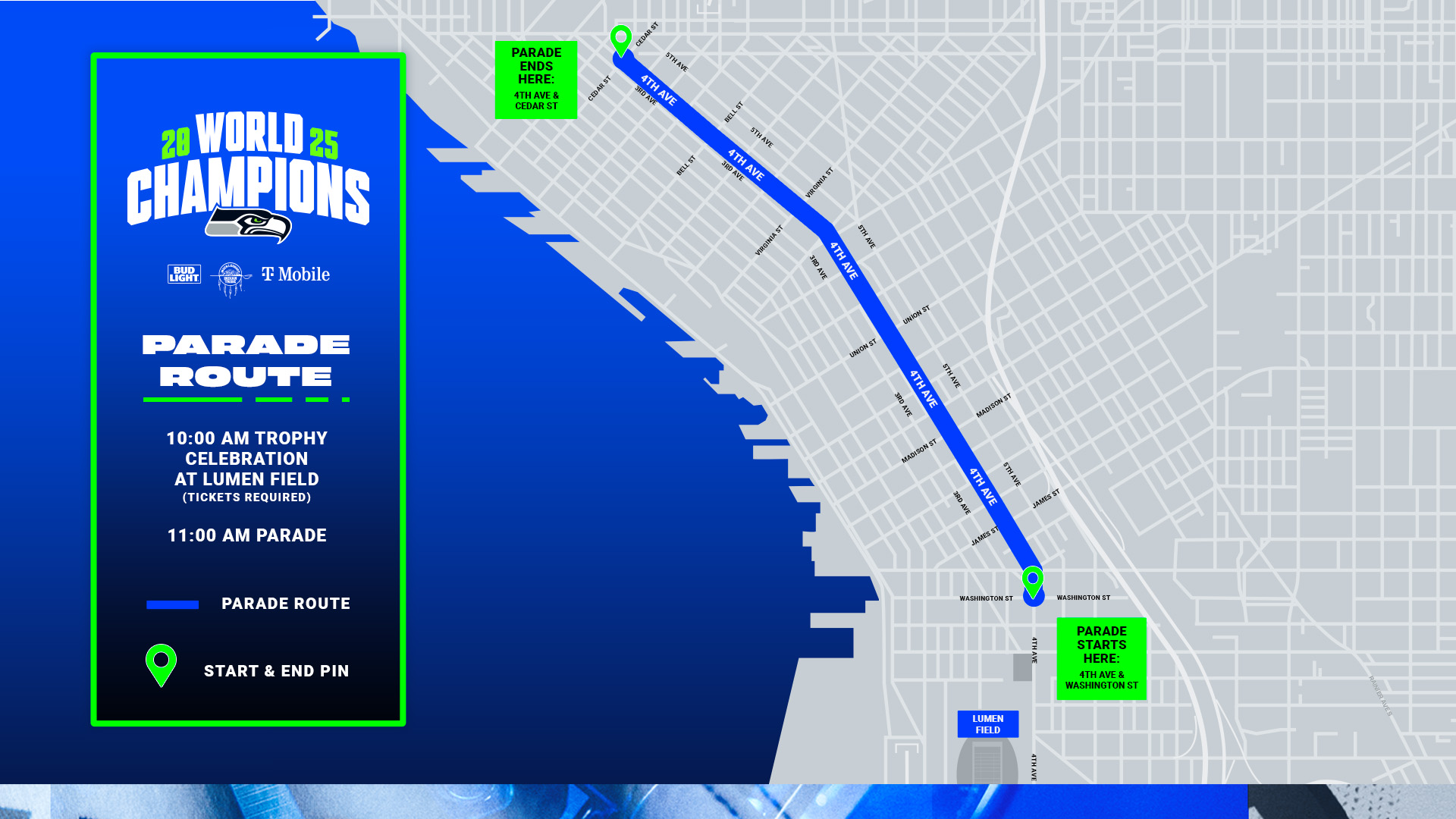 Let's celebrate! The Seahawks World Champions Parade, presented by Bud Light, Muckleshoot Indian Tribe, and T‑Mobile is on Wednesday, February 11. The event will begin with a Trophy Celebration at 10 am at Lumen Field (tickets required), followed by a parade along 4th Ave in downtown Seattle at 11am.